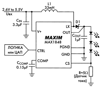 Главное преимущество при включении светодиодов в последовательную цепочку состоит в том, что через все диоды протекает одинаковый ток и яркость свечения получается одинаковой. Недостаток при таком включении: требуется более высокое напряжение, так как падение напряжения на каждом светодиоде суммируется. Даже 3 белых светодиода требуют напряжение 9 - 12 вольт. Обычно для такого включения используются ключевые регуляторы, как наиболее эффективные преобразователи для этих целей. На рисунке 7 представлена схема включения ключевого регулятора MAX 1848, предназначенного для управления тремя белыми светодиодами, включенными последовательно. Прибор может запитываться от 2,6 до 5,5 вольт при выходном напряжении до 13 вольт. Входной диапазон рассчитан на одну Li-ионную батарею или 3 NiCD/NiMH батареи. Рабочая частота регулятора - 1,2 мГц, что позволяет использовать внешние компоненты с минимальными габаритами. На выходе ШИМ сигнал. Избыточное напряжение выпрямляется и подается на светодиоды. Ток через светодиоды и, таким образом, яркость может быть отрегулирована с помощью напряжения снимаемого с ЦАП или отфильтрованного ШИМ сигнала, подаваемого на вход CTRL микросхемы MAX 1848. Эффективность MAX 1848 при работе со светодиодами достигает 87%.