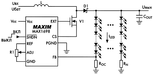 Для больших дисплеев, где требуется много светодиодов, можно использовать ключевой регулятор MAX 1698 (см. рис. 8). Микросхема может работать от входного напряжения всего 0,8 Вольта, а выходное напряжение ограничено рабочим напряжением внешнего n - канального МОП - транзистора. Низкое, до 300 mB напряжение обратной связи (вывод FB) способствует максимальной эффективности схемы, которая достигает 90%. Яркость светодиода регулируется с помощью потенциометра, у которого щетка соединяется с выводом ADJ микросхемы. Потенциометр может быть использован как аналоговый, так и цифровой.