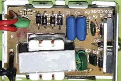 Применены резисторы МЛТ, С2-23, держатель плавкой вставки ДВП4-1. Выключатели SA1 и SA2 - рокерные HF-606, их можно заменить аналогичными MR21, SWA206A, OR-L или другими, рассчитанными на коммутацию сетевого напряжения и ток до 2 А. Двухобмоточный дроссель L3 - промышленного изготовления от компьютерного БП. Дроссель можно заменить аналогичным с общим сопротивлением обмоток не более 2 Ом, чем больше индуктивность, тем лучше. Подойдут, например, дроссели от импульсных БП телевизоров, компьютерных мониторов. Конденсаторы C5 и C6 - плёночные, рассчитанные на работу в сети 230 В, подойдут, например, конденсаторы К73-17, К73-24 с номинальным напря-жением не менее 630 В. Конденсатор C7 - оксидный любого типа. Диод PR3005 можно заменить диодами FR306, SRP300J, 31DF4, 1N5407. На место диодов D5, D7, D8 в ЭТжелатель-но установить быстродействующие диоды UF4007 или 1N4937GP, RGP15M, BYT52M. Вместо диодов КД522Б могут работать любые из серий КД510, КД521, 1 N4148, PMLL4148. Светодиод L-44YD - жёлтого свечения, его можно заменить любым общего применения без встроенных резисторов, например, из серий КИПД21, КИПД40, АЛ336, L-63.