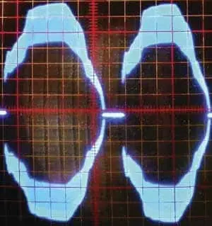 Для этого ЭТ выбрана задача - питание низковольтного 12-вольтного электропаяльника. При испытаниях устройства были получены следующие параметры. Минимальная потребляемая нагрузкой мощность, при которой ЭТ работает устойчиво, - 12 Вт (паяльник - 12 В, 12 Вт). Максимальная выходная мощность - 45...47 Вт (лампа накаливания - 12 В, 60 Вт). При увеличении потребляемой нагрузкой мощности от 12 до 45 Вт выходное напряжение уменьшается на 1 В. Рабочая частота преобразователя - около 29 кГц, размах напряжения на выходе - около 60 В. Огибающая выходного напряжения - искажённая синусоида частотой 100 Гц, промодулированная частотой 29 кГц (рис. 3). Ёмкость между обмотками трансформатора L2 - около 7 пФ.