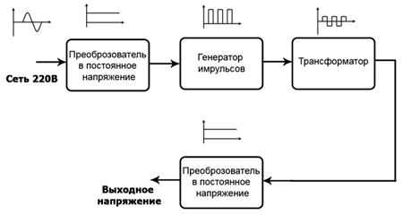 Она соответствует большинству импульсных источников питания. Переменное напряжение преобразовывается в постоянное, затем генератор импульсов преобразует ток в переменный с высокой частотой. Теперь на базе ВЧ сигнала легко сформировать нужное постоянное напряжение заданного уровня или даже нескольких уровней.