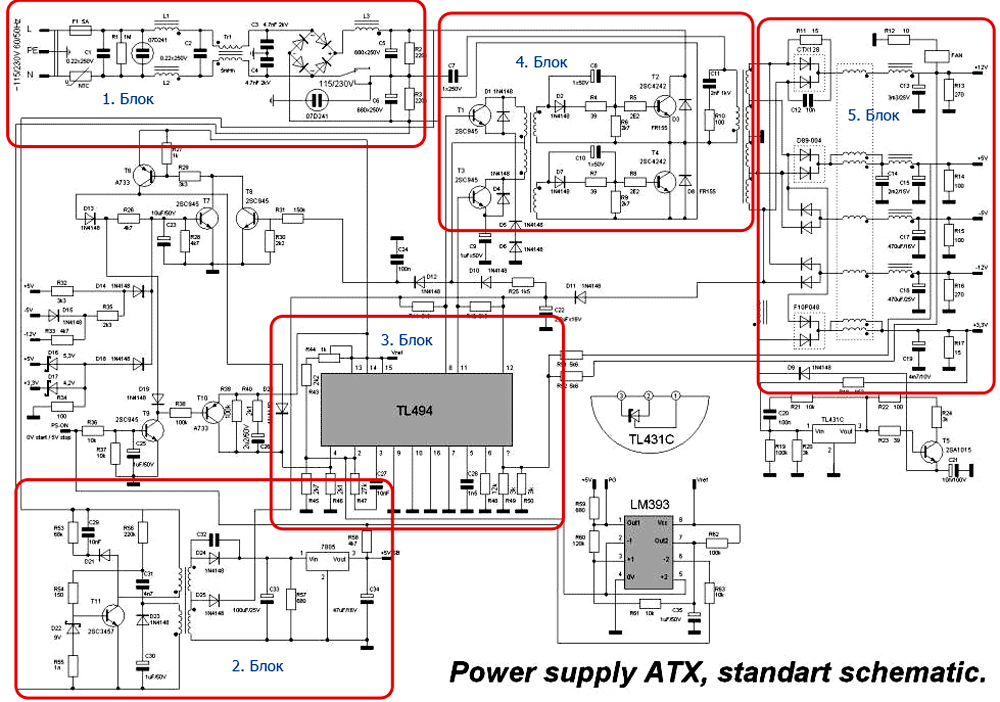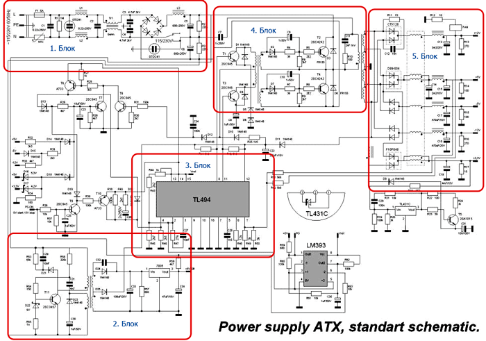 Если упомянутую блок-схему наложить на принципиальную схему БП АТХ, то получится следующее.