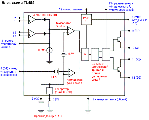 Блок схема (основные компоненты) микросхемы TL494 выглядит следующим образом.