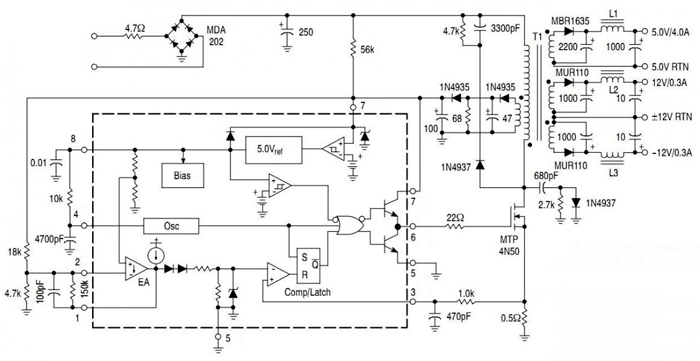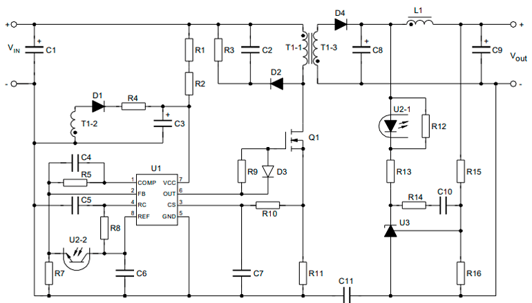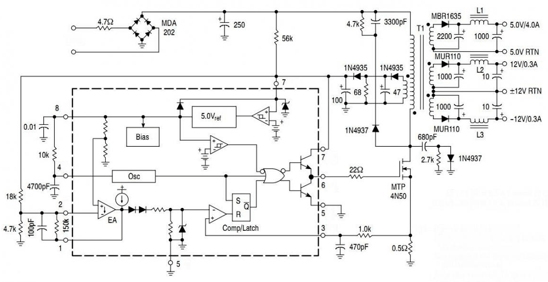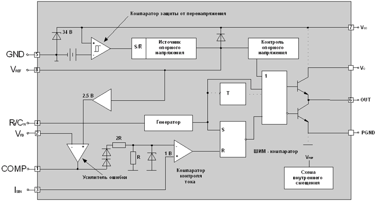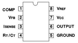 Микросхема UC 3842 реализует ШИМ-контроллер с обратной связью, построенный на базе полевых транзисторов.