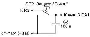 Цепь R11C7 и резистор R1 можно не устанавливать и в том случае, если работа источника в режиме ограничения тока не предполагается, а требуется только триггерный режим. В этом случае коллектор транзистора VT2 следует соединить с выводом 2 DA1 напрямую, а выключатель SB2 заменить переключателем, включив его в разрыв провода, соединяющего резистор R9 с выводом 3 DA1 по схеме, изображённой на рис. 2. При выключенной триггерной защите выходной ток источника [1] будет ограничен на уровне около 2,5 А.