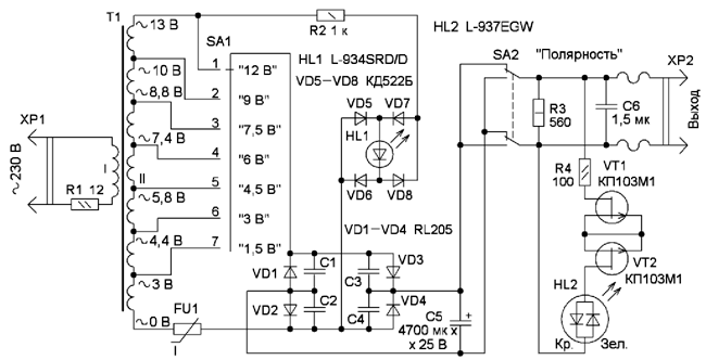 Поскольку блок питания имеет переключатель полярности выходного напряжения SA2, для уменьшения вероятности ошибок устройство было дополнительно оснащено светодиодным индикатором полярности на элементах HL2, R4, VT1 и VT2. Когда переключатель SA2 находится в верхнем по схеме положении, генератором стабильного тока работает полевой транзистор VT2 и в светодиоде HL2 светит кристалл красного цвета. В нижнем по схеме положении SA2 ток через светодиод будет стабилизировать транзистор VT1, светит зелёный кристалл светодиода. Резистор R4 - защитный. Индикатор полярности работает при выходном напряжении более 2 В.