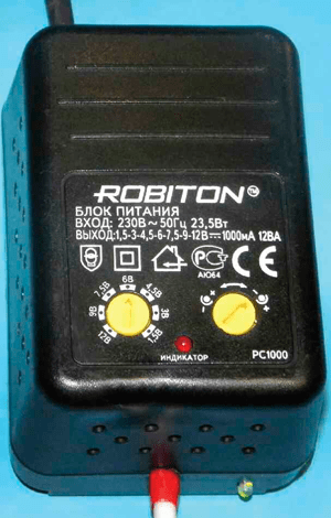 В наличии оказался неисправный нестабилизированный сетевой блок питания (адаптер) Robiton PC1000, рассчитанный на выходной ток до 1 А с переключаемым выходным напряжением постоянного тока 1,5, 3, 4,5, 6, 7,5, 9 и 12 В. Кроме переключателя выходного напряжения, этот блок питания также оснащён переключателем его полярности. Аналогичные блоки питания распространены под разными торговыми марками, их обычно приобретают для питания различной маломощной аппаратуры, детских игрушек взамен вышедших из строя штатных питающих устройств.