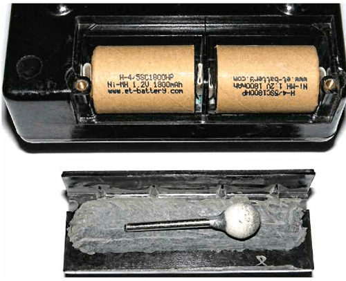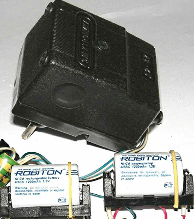 Поэтому автор задался вопросом: а нельзя ли использовать для питания тестера ТЛ-4 аккумуляторы подходящего размера? Как оказалось, подобные аккумуляторы существуют, доступны, а стоимость некоторых из них даже ниже стоимости элемента LR10. Это аккумуляторы 4/5SC (23x34 мм), которые широко применяются в источниках питания шуруповёртов. Аккумуляторы этого типоразмера бывают никель-кадмиевыми (Ni-Cd) и никель-металлогидридными (Ni-MH), их ёмкость - от 1 до 4 А·ч, и выпускают их многие компании, причём стоимость Ni-Cd аккумуляторов небольшой ёмкости (1,2 А·ч) даже меньше стоимости элемента LR10. Длина аккумуляторов (34 мм) позволяет свободно размес-тить их в батарейном отсеке тестера ТЛ-4. Для более плотного контакта с лепестками отсека между ними и корпусом необходимо проложить отрезок широкой ПВХ-трубки (кембрика). А вот диаметр аккумулятора (23 мм) на 3 мм превышает диаметр элемента LR10 (20 мм), в связи с чем крышку батарейного отсека тестера ТЛ-4 с этими аккумуляторами закрыть до конца невозможно.