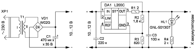 В качестве зарядного устройства могут служить любые специализированные блоки, предназначенные, например, для зарядки аккумуляторов типа АА, однако автор уже достаточно длительное время пользуется собственно изготовленным зарядным устройством, предназначенным для зарядки аккумуляторов различных типов. Схема устройства показана на рис. 3. Оно собрано на достаточно известной и недорогой микросхеме L200C, с помощью которой можно ограничить ток зарядки и выходное напряжение. Конденсаторы C2 и C3 - блокировочные. Максимальный выходной ток Iмакс можно установить подборкой резистора R1: Iмакс = 0,45/R1 = 0,22 А, а максимальное выходное напряжение имакс зависит от отношения сопротивления резисторов R2 и R3, в данном случае Uмакс = 2,73(1+R2/R3) = 8,7 В.