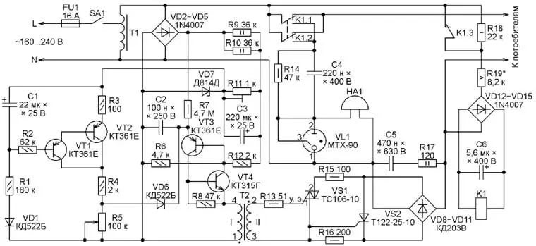 Во время работы стабилизатор должен быть защищён от напряжения в питающей его сети более 250 В. Я применяю для этого защитное устройство "АЛЬБАТРОС-12345" [3]. Тем не менее в своём стабилизаторе я предусмотрел и узел защиты от превышения допустимого напряжения на выходе стабилизатора, которое может случиться, например, при пробое симистора VS1 или тиристора VS2. В таком случае этот узел должен отключить потребителей и включить звуковую сигнализацию.