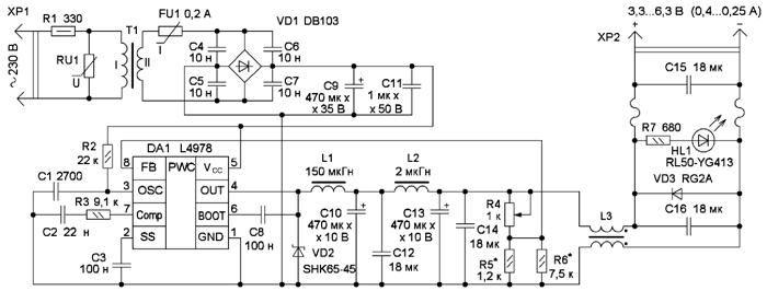Напряжение сети 230 В поступает на первичную обмотку понижающего трансформатора T1 через предохранительный резистор R1. Варистор RU1 защищает трансформатор от повышенного напряжения. Со вторичной обмотки трансформатора напряжение около 19 В переменного тока через самовосстанавливающийся предохранитель FU1 поступает на мостовой диодный выпрямитель на диодной сборке VD1. Конденсатор C9 сглаживает пульсации выпрямленного напряжения. Частота работы преобразователя DA1 - около 70 кГц и зависит от ёмкости конденсатора C1 и сопротивления резистора R2. Конденсатор C8 - элемент вольтодобавки, дроссель L1 - накопительный. Выходное напряжение поступает на нагрузку через LC-фильтры C10C12L2C13C14 и L3C16. Выходное напряжение от 3,3 до 6,3 В регулируют переменным резистором R4. Чем меньше его сопротивление, тем меньше выходное напряжение.