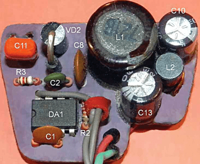Дроссель L1 (от кинескопного компьютерного монитора) намотан на ферритовом H-образном магнитопроводе внешним диаметром 12 мм и высотой 15 мм, обмоточный провод - многожильный с общим сечением по меди около 0,5 мм2. От этого дросселя отмотано несколько витков, чтобы индуктивность получилась около 150 мкГн. Если на магнитопроводе дросселя закреплены постоянные магниты, их обязательно нужно удалить. Дроссель L2 - аналогичный меньшего размера индуктивностью до 15 мкГн: чем меньше сопротивление обмотки, тем лучше. Дроссель L3 намотан сложенным вдвое многожильным монтажным проводом общим сечением 0,5 мм2 на магнитопроводе от трансформатора из электронного балласта КЛЛ и содержит три витка.