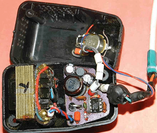 У БП при токе нагрузки 0,3 А и выходном напряжении 5 В амплитуда пульсаций не превышает 30 мВ. Он проверялся на электромагнитную совместимость с УКВ-радиоприёмни-ком с низкой ПЧ. Какого-либо негативного влияния не зафиксировано, даже если телескопическую антенну положить на корпус блока питания. Радиоприёмник, работающий в диапазоне ДВ, "чувствует" БП при приближении его магнитной антенны на расстояние менее 25 см. Во всех случаях радиоприёмники питались от этого БП. В корпусе БП просверлено около 70 вентиляционных отверстий диаметром 2,3 мм, его внешний вид показан на рис. 4. Бп потребляет от сети мощность 0,4 Вт в режиме холостого хода и около 3,9 Вт при максимальной выходной мощности.