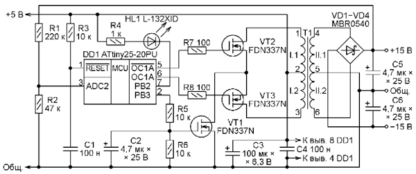 Часть плюсового выходного напряжения преобразователя поступает через делитель напряжения из резисторов R1 и R2 для контроля на вход ADC2 микроконтроллера, служащий в данном случае входом встроенного аналогового компаратора. При указанных на схеме номиналах резисторов делителя транзистор VT1 выключает силовую часть преобразователя при выходном напряжении любой полярности менее 6 В, так как при перегрузке минусового выхода снижается и напряжение на плюсовом. Одновременно программа включает светодиод HL1, сигнализируя о неполадке. Для повторного запуска преобразователя необходимо выключить и вновь включить его питание.