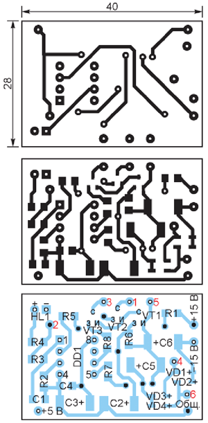 Для уменьшения числа переходных отверстий для выводов трансформатора предусмотрены разнесённые по плате контактные площадки, номера подключаемых к ним выводов трансформатора обозначены на рис. 2 цифрами красного цвета. Сам трансформатор T1 установлен поверх компонентов и зафиксирован каплей клея. Его намоточные данные приведены в упомянутой выше статье.