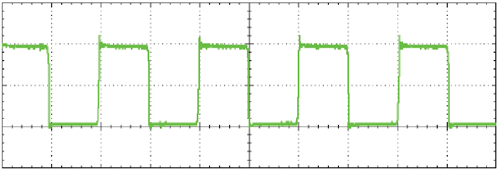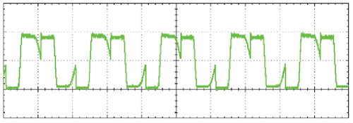 На рис. 4 изображена осциллограмма напряжения в той же точке при оптимальных бестоковых паузах. На ней виден и небольшой выброс напряжения в момент закрывания транзистора. В обоих случаях коэффициент отклонения луча по вертикали - 5 В/дел., а скорость развёртки - 5 мкс/дел. Осциллограммы импульсов на стоке транзистора VT3 аналогичны рассмотренным выше, но сдвинуты по оси времени на половину периода повторения.