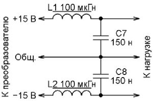 Если для устройства, питаемого от преобразователя, потребуется ещё уменьшить пульсации, то сделать это можно с помощью LC-фильтра, схема которого показана на рис. 5, подклю-чив его между преобразователем и нагрузкой. Я использовал в качестве L1 и L2 дроссели EC24-101K индуктивностью 100мкГн. Конденсаторы C7 и C8 - керамические. Этот фильтр при нагрузке каждого выхода резистором сопротивлением 1 кОм понизил пульсации напряжения до 5...10 мВэфф.