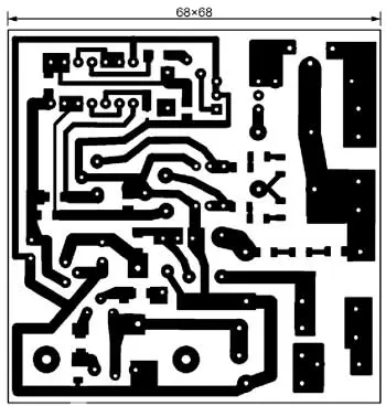 Печатная плата (рис. 3) изготовлена методом термопереноса рисунка печатных проводников на медное покрытие фольгированного с одной стороны текстолита. На её свободную от фольги сторону тем же методом нанесены позиционные обозначения элементов и пояснительные надписи.