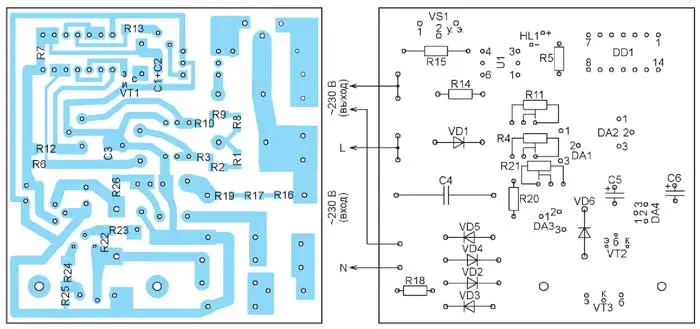 Хочу сразу отметить, что обычным мультиметром измерить амплитуду пульсирующего напряжения на управляющих электродах стабилизаторов нельзя. Поэтому для регулировки порогов приходится подавать на вход устройства сетевое напряжение через лабораторный регулируемый автотрансформатор (ЛАТР). Поочерёдно устанавливая с его помощью это напряжение равным нижнему (обычно 180 В) и верхнему (обычно 250 В) допустимым пределам, находят такие положения движков подстроечных резисторов (соответственно R4 и R11), при которых на выводах 8 и 9 логического элемента DD1.4 начинают появляться импульсы. В полностью собранном устройстве регулировку можно производить и без контроля появления импульсов по гашению светодиода HL1.