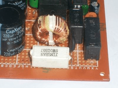 На входе питания дроссель, состоящий из двух непересекающихся обмоток, на кольце от БП. Обе обмотки одинаковые, намотанные проводом диаметром 1мм, по 9 витков каждая.