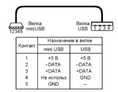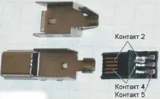 Итак, разбираем вилку разъёма miniUSB и извлекаем контактную группу. Затем в её пластмассовой заливке по границам контактов 2 и 4 делаем узкой гранью плоского надфиля пропилы до касания с контактами. Теперь их нетрудно извлечь, потянув пинцетом. Удалив короткий контакт 4, в его посадочное место аккуратно вставляем пинцетом бывший контакт 2. Далее к контакту 5 и новому контакту 4 припаиваем жилы двухпроводного кабеля, устанавливаем пластмассовую вставку с доработанной контактной группой в металлическую часть вилки miniUSB и, соединив её половинки, надеваем на них пластмассовую обойму из комплекта вилки.