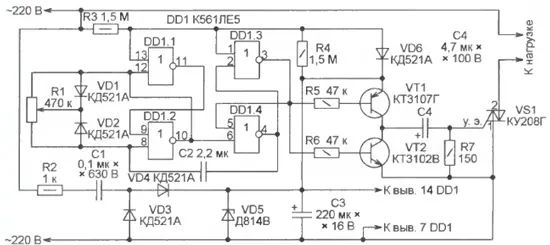 Элемент DD1.3 служит формирователем импульсов с частотой сетевого напряжения, поступающего на его вывод 1 через делитель из резисторов R3 и R4, причем каждый импульс начинается вблизи перехода мгновенного значения сетевого напряжения через ноль. С выхода элемента DD1.3 эти импульсы через ограничительные резисторы R5 и R6 поступают на базы транзисторов VT1, VT2. Усиленные транзисторами импульсы управления через разделительный конденсатор С4 приходят на управляющий электрод сими-стора VS1. Здесь их полярность соответствует знаку сетевого напряжения, приложенного в этот момент к выв. 2 симистора.