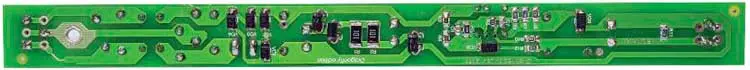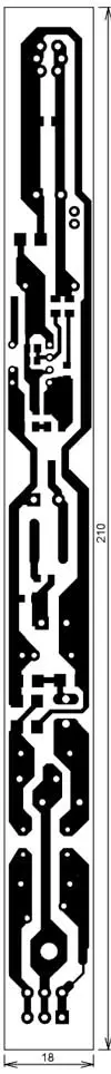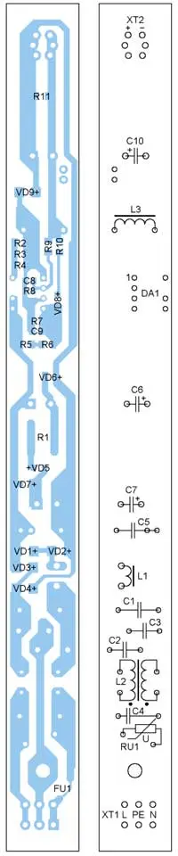 Печатная плата источника питания разрабатывалась для установки в низкопрофильный потолочный светильник. Высота печатной платы с установленными на ней всеми элементами, определяемая высотой дросселя L3, равна 16 мм. Внешний вид платы собранного устройства показан на рис. 2 и рис. 3. Чертёж платы приведён на рис. 4, а расположение элементов - на рис. 5. Дроссель L3 индуктивностью 0,9 мГн выполнен на стандартном малогабаритном магнитопроводе Е16/8/5 (материал N87 или аналогичный) с немагнитным зазором 0,9 мм. Его обмотка содержит 186 витков провода диаметром 0,3 мм. Дроссель помехоподавляющего фильтра L2 имеет индуктивность 30 мГн. Он намотан на стандартном малогабаритном магнитопроводе Е10/5,5/5, каждая обмотка содержит по 110 витков провода диаметром 0,2 мм. Можно применить подходящий по размерам стандартный дроссель от фильтра импульсного источника питания.