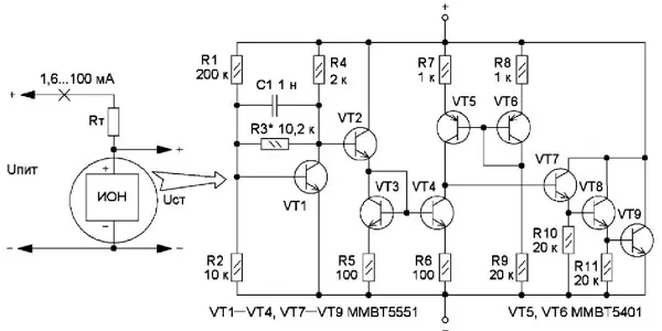 Два токовых зеркала имеют очень большой коэффициент усиления, что делает температурные коэффициенты транзисторов VT7-VT9 не принципиальными для работы ИОН.