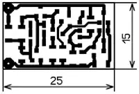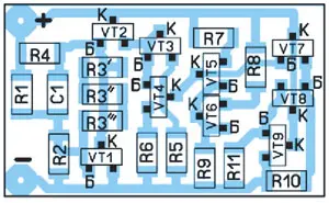 При сопротивлении резистора Rт = 250 Ом и изменении напряжения Uпит от 7 до 30 В напряжение на ИОН изменяется с 4,3 В до 4,29 В, т. е. на 0,01 В, что соответствует крутизне 0,4 мВ/В. Чертёж для изготовления печатной платы показан на рис. 3, а схема расположения на ней элементов - на рис. 4. У этого устройства есть один большой недостаток. После проведения компенсации и налаживания выходное напряжение может заметно отличаться от желаемого, это будет зависеть от разности параметров применённых транзисторов. Но есть и хорошая новость, в этом устройстве при желании можно получить различное напряжение, изменив номиналы резистора R9 и резистора R4. После этого надо провести всё налаживание по термокомпенсации заново. Минимальное выходное напряжение - 3 В. На основе этого схемного решения можно изготовить термодатчики, термореле, стабилизаторы тока и т. д.