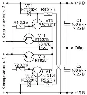 Конденсаторы С19 и С20 совместно с резисторами R17 и R18 образуют фильтры нижних частот, повышающие помехоустойчивость системы защиты. Увеличивать номиналы этих конденсаторов свыше 4700 пФ нежелательно, поскольку это увеличит время срабатывания защиты и пиковые токи через транзисторы VT9 и VT10. Чтобы защита срабатывала одновременно в обоих плечах стабилизатора, предусмотрена связь между триггерными ячейками через конденсаторы C21 и C22.