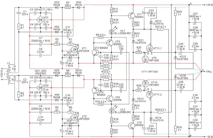 Для уменьшения рассеиваемой на транзисторах VT9 и VT10 мощности истоки транзисторов VT 11.1 и VT 11.2 соединены не с общим проводом, а с точками соединения стабилитронов и резисторов (соответственно VD15, R29 и VD16, R30). Поэтому потенциалы истоков транзисторов VT11.1 и VT11.2 равны напряжению стабилизации соответствующих стабилитронов (6,2 В по абсолютному значению). Это позволяет изменять управляющее напряжение на затворах транзисторов VT9 и VT10 не до 0 В, как в прототипе, а до плюс или минус 6 В. При этом напряжение между истоком и стоком этих транзисторов на пиках пульсаций может падать до 3 В и ниже без выхода из режима стабилизации.