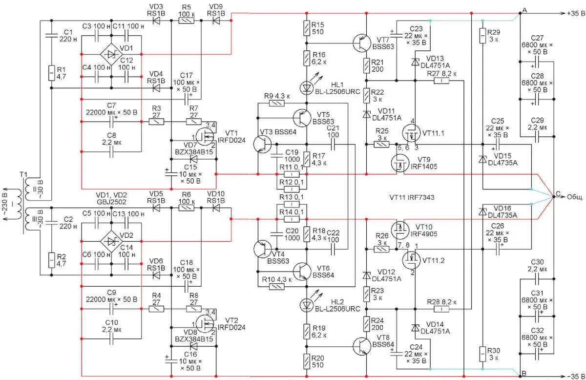 Современные УМЗЧ, обладая внушительной пиковой выходной мощностью, доходящей порой до 200 Вт, предъявляют довольно жёсткие требования к своему источнику питания. Для них, как правило, необходимо двухполярное напряжение 2 X (30...40) В при пиковом токе до 10 А в каждом плече. Обычно в выпрямителе применяют сглаживающие конденсаторы большой ёмкости, доходящей до 20000 мкФ и более. Но даже с ними просадки выпрямленного напряжения при пиковом токе нагрузки достигают 2...3 В, что требует от УМЗЧ высокого коэффициента подавления пульсаций напряжения питания. Автор предлагает оснастить блок питания УМЗЧ стабилизатором, обеспечивающим нужное качество питающего напряжения.