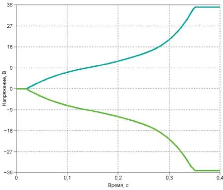 Выходное напряжение плюсового плеча стабилизатора равно сумме напряжений стабилизации стабилитронов VD13, VD15 и напряжения отсечки транзистора VT11.1, а минусового плеча - соответственно стабилитронов VD14, VD16 и транзистора VT11.2. Для плавного запуска стабилизатора оказалось достаточно зашунтировать стабилитроны VD13-VD16 конденсаторами C23-C26. Скорость изменения выходного напряжения до начала стабилизации равна скорости нарастания напряжения на этих конденсаторах. При указанных на схеме номиналах элементов время выхода стабилизатора на режим - около 360 мс. Осциллограммы процесса его запуска, полученные на компьютерной модели, показаны на рис. 3.