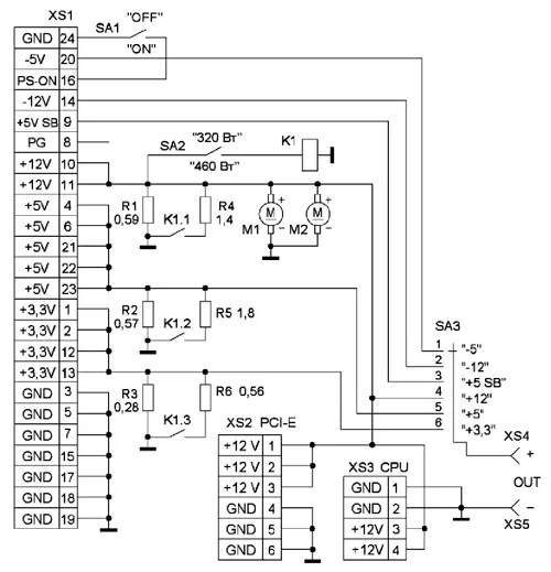 После подключения всех необходимых кабелей блока к разъёмам стенда выключателем SA1 включают контролируемый блок питания. Вентиляторами M1, M2 осуществляется обдув нагрузочных резисторов для их охлаждения (рис. 2). Для увеличения эффективности охлаждения резисторов один вентилятор работает на вдув окружающего воздуха, а другой - на выдув из блока. Вольтметром, подключённым к выходным клеммам XS4, XS5 "OUT", можно осуществлять контроль за выходными напряжениями с помощью переключателя SA3. Появляется возможность контролировать напряжения +3,3 В, +5 В, +12 В, -5 В, -12 В и +5 В (SB). Напряжение -5 В имеется только на старых блоках с 20-контактным разъёмом, а на блоках с 24-контактным разъёмом оно, как правило, отсутствует. В стенде предусмотрены два варианта суммарной мощности нагрузки - 320 Вт и 4б0 Вт. Эти значения и определили сопротивления нагрузочных резисторов R1-R6. Выбор режимов осуществляется с помощью выключателя SA2, который подаёт питающее напряжение на реле К1, подключающее дополнительные нагрузочные резисторы к основным.