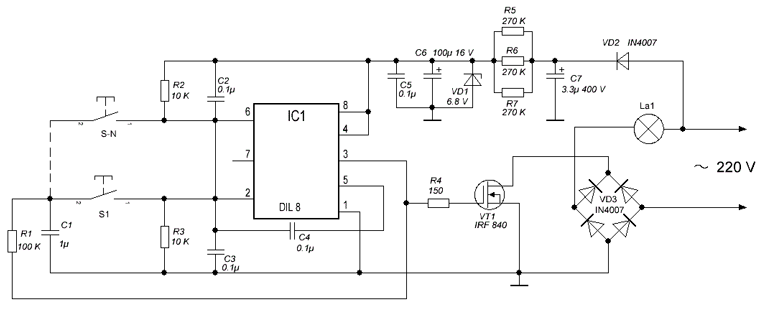 Еще одна примечательная схема построена на таймере 555. Примечательна она тем, что питающее напряжение используется сетевое, а нагрузок можно подключить несколько, равно, как и кнопок. На схеме указаны места последующих подключений.