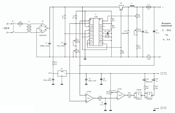 В качестве трансформатора может служить любой сетевой понижающий трансформатор, с напряжением 40В. Выходное напряжение при этом, регулируется от 2В до 30В. Дроссель выпаян из неработающего БП от компьютера, можно экспериментировать с ним. Намотан на ферритовом кольце.