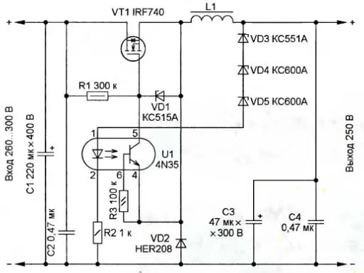 Далее, по мере разрядки выходных конденсаторов на нагрузку, напряжение на них уменьшается, стабилитроны VD3-VD5 и излучающий диод оптрона закрываются. В результате этого фототранзистор оптрона тоже закрывается и перестаёт шунтировать стабилитрон VD1. Но транзистор VT1 сразу не может открыться, так как его ёмкость затвор- исток разряжена Эта ёмкость (примерно 1 нФ) заряжается током, протекающим через резистор R1 (около 1 мА). В течение нескольких микросекунд напряжение между затвором и истоком транзистора VT1 возрастает до уровня 4...5 В, необходимого для его открывания. После открывания транзистора VT1 закрывается диод VD2 и повторяется описанный выше процесс накопления энергии в магнитопроводе дросселя L1.