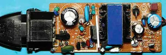 Пластмассовый корпус БП, состоящий из двух половин, скреплённых несколькими каплями клея, нетрудно разобрать с помощью острого ножа и широкой плоской отвёртки. После осмотра монтажа, не выявившего каких-либо вышедших из строя под действи-