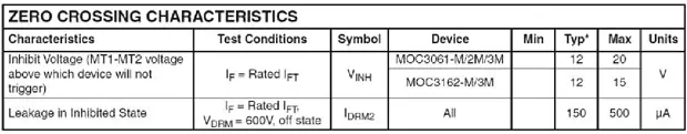 Устройство оптронов MOC3161 - MOC3163 иллюстрирует рис. 1, взятый из [1]. ZCC включена между силовыми электродами оптосимистора и осуществляет подачу сигнала на его управляющий электрод. Она разрешает или запрещает включение оптосимистора в зависимости от напряжения на нём. Согласно [1], при напряжении на опто-симисторе более 12...20 В он открываться не будет (рис. 2), даже если через излучающий ИК-диод оптрона протекает ток, превышающий открывающий. При этом ток через оптопару не превышает 500 мкА при напряжении 600 В. Аналогично устроены и другие оптроны с ZCC, например [2].
