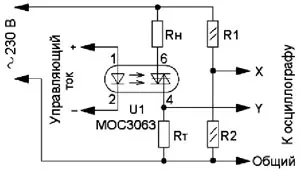 Для иллюстрации этой ситуации был собран макет, схема которого показана на рис. 4. Здесь использованы разные типы нагрузок. Сигнал, пропорциональный напряжению сети, с резистивного делителя R1R2 поступает на первый вход осциллографа, а сигнал, пропорциональный току нагрузки с датчика тока (резистора Ry), - на второй вход