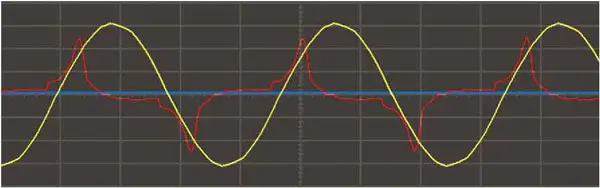 Осциллограммы для светодиодной лампы мощностью 2 Вт со встроенным блоком питания на основе балластного конденсатора показаны на рис. 7. Видно, что фазы напряжения и тока заметно отличаются, и включение оптосимистора происходит не при нулевом напряжении сети.
