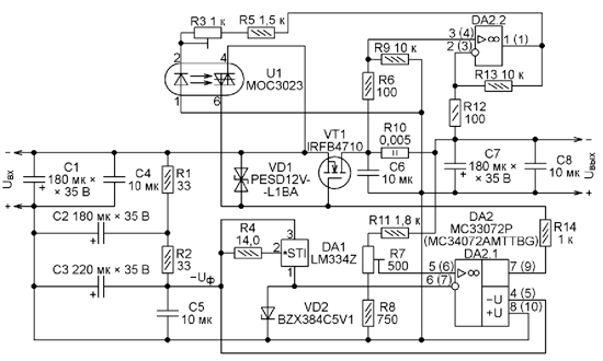 Номера выводов одинакового назначения у микросхем MC33072P (в корпусе DIP8 размерами 10x8 мм) и MC34072AMTTBG (в корпусе WQFN10 размерами 2,6x2,6 мм) неодинаковы. Поэтому на схеме номера выводов микросхемы MC34072AMTTBG и её название заключены в скобки. Электрические характеристики этих микросхем идентичны. Различаются лишь допустимые интервалы рабочей температуры (-40...+ 25оС у MC34... и -40...+85оС у MC33...).
