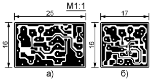 Печатная плата для стабилизатора была разработана в двух вариантах: под сдвоенный ОУ MC33072P (рис. 2,а) и под сдвоенный ОУ MC34072AMTTBG (рис. 2,б). Размер первой платы - 16x25 мм, а второй - 16x17 мм. Обе они изготовлены из фольгированного с одной стороны стеклотекстолита. Расположение элементов на этих платах показано соответственно на рис. 3 и рис. 4. Обратите внимание, что на плате под микросхему MC34072AMTTBG отсутствует конденсатор С4, что не повлияло на характеристики стабилизатора, а подстроечный резистор R3 и постоянный резистор R5 соединены на ней иначе, чем на схеме рис. 1.