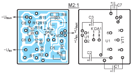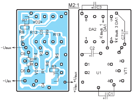В статье описан стабилизатор напряжения с регулирующим элементом в минусовом проводе, собранный на полевом транзисторе и ОУ, и сетевой двухполярный источник питания с такими стабилизаторами. Приводятся два варианта печатной платы стабилизатора, рассчитанные на установку ОУ в разных корпусах.