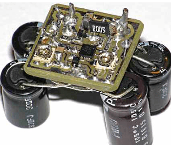 Внешний вид собранного стабилизатора с микросхемой MC34072AMTTBG показан на рис. 5 со стороны печатных проводников, а на рис. 6 - со стороны установки полевого транзистора, оксидных конденсаторов, оптрона и стабилизатора тока. Хотя на фотоснимках выводы оксидных конденсаторов оголены, во избежание случайных замыканий на них рекомендуется одеть ПВХ или лучше фторопластовые трубки.