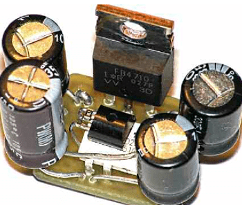 Как показал эксперимент, увеличение на порядок ёмкости конденсаторов в первом звене фильтра питания ОУ сильно снизило размах пульсаций выходного напряжения стабилизатора же без использования активного фильтра. Это позволило вообще исключить этот фильтр, сэкономив мощный полевой транзистор, значительно упростив схему стабилизатора и высвободив ОУ, работавший в активном фильтре. В предлагаемом стабилизаторе на этом ОУ построен узел токовой защиты. Упростилась и трассировка печатных проводников, что позволило уменьшить размеры печатной платы.
