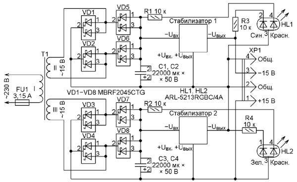 Трёхцветные светодиоды ARL-5213RGBC/4A (HL1 и HL2) служат индикаторами наличия напряжения на выходах стабилизаторов и их перехода в защитный режим. Они имеют вывод общего анода и три вывода от катодов кристаллов каждого (красного, зелёного и синего) цветасвечения. Светодиод HL1 - индикатор состояния канала напряжения -15 В, а светодиод HL2 - индикатор состояния канала напряжения + 15 В.