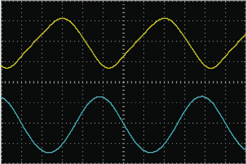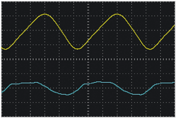 Осциллограммы жёлтого цвета на рис. 8 и рис. 9 показывают пульсацию напряжения ивх при токе нагрузки немного больше 9 А. Коэффициент отклонения по вертикали - 0,5 В/дел. Размах пульсаций от пика до пика - 1,22 В.