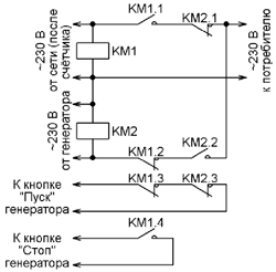 Примечание. Недостатки предложенного устройства - наличие гальванической связи между генератором и сетью, а также коммутация только одного из двух проводов, идущих к потребителю. Для их устранения потребуется усложнить устройство, применив в нём контакторы, у которых больше силовых контактов.