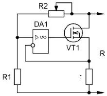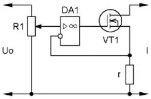 где UОУН - задающее напряжение, подаваемое на неинвертирующий вход ОУ, r - сопротивление токоизмерительного резистора.